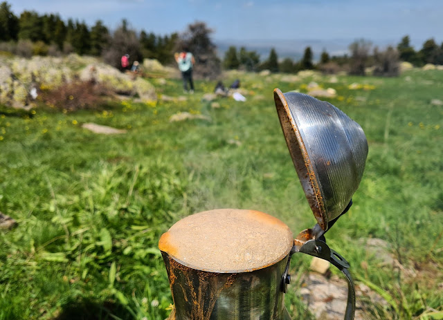 On piste, on piste et les heures passent. Il est temps de casser la croute. En sortant de la forêt, on entre sur l'alpage, une zone plus ouverte, sans arbres et avec beaucoup d'herbe, des plantes qui seront broutées par les troupeaux de vaches ou de moutons dans quelques semaines. Pour le moment, il n'y a que nous. On a oublié que l'ours était là. On a appris à faire un feu car c'est un truc que l'on ne fait pas n'importe comment. On peut mettre le feu à la montagne et faire disparaître tout ce que nous venons d'observer. Faire un feu, ça s'apprend pour éviter les catastrophes : Le faire dans une zone ouverte, la moins sèche possible. On ne fait pas de feu quand il fait très sec comme en été. On regroupe des cailloux pour cercler le feux. On enlève tout ce qui est sec, feuilles, branches qui se trouvent autour. Avec des petits morceau de bois secs, on le démarre. C'est un tout petit feu que l'on alimente petit à petit pour chauffer l'eau de la sources et se faire une tisane (sauges, thym, un peu de pomme, de cannelle et de sucre).